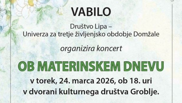 Društvo Lipa - Univerza za tretje življenjsko obdobje Domžale, organizira koncert ob materinskem dnevu v torek, 24. marca 2026 ob 18. uri, v dvorani kulturnega društva Groblje.
